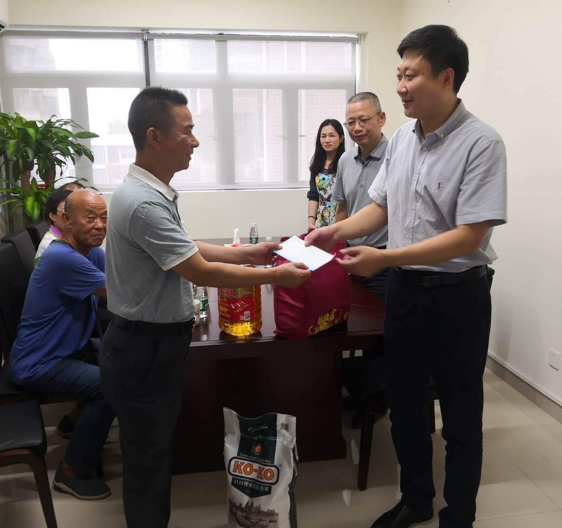 6月18日,在七一党的生日来临之际,光明区委卫生工委委员、区卫健局调研员、国科大深圳医院院党委书记杨镇华在西院区综合楼会议室慰问医院困难党员和老党员,了解党员的工作情况、身体状况和生活困难,并为他们送上慰问品和慰问金。(通讯员 王文娟)