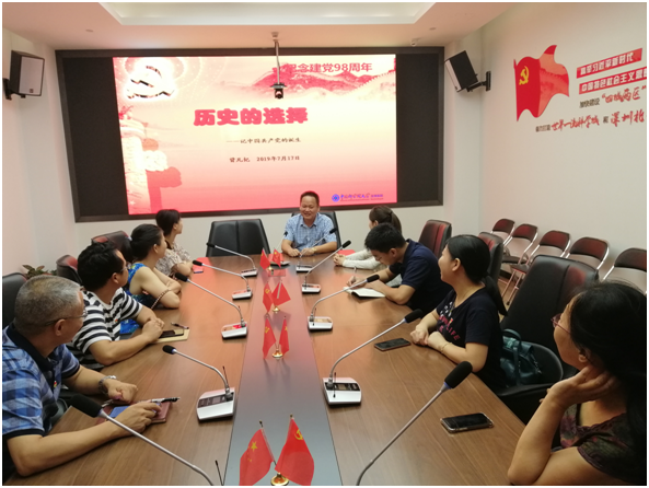 7月17日,第十二党支部在光明区党群服务中心开展庆祝建党98周年“七一”主题党日活动。在工作人员的指引下,支部党员全面了解光明区的风土人情及人文历史,回顾共产党98年来走过的路,深入感受过去的峥嵘岁月。穿过时光隧道,党员们在党旗下重温入党誓词,坚定当初加入中国共产党的信念,不忘初心、牢记使命。最后,党支部书记以《历史的选择》为主题讲了一堂生动的党课,课后一起高歌《没有共产党就没有新中国》,在激昂的歌声中结束了当天的活动。(通讯员 曾文娇)