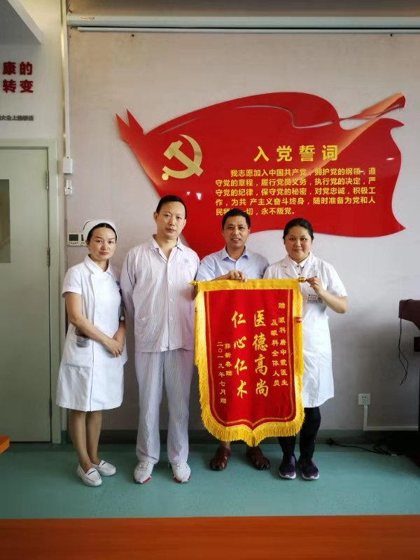 7月21日,患者郭新春为第七党支部党员、眼科唐中霞副主任医师送来锦旗,感谢唐中霞医师及眼科全体医护人员为他及时处理眼部外伤急症。(通讯员 莫映兰)
