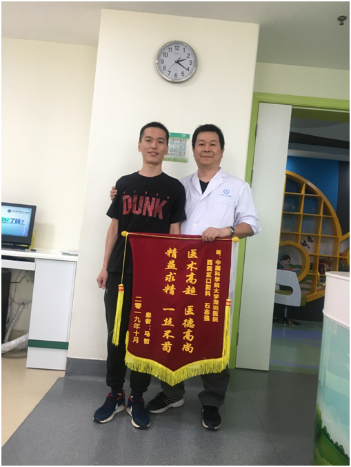 10月22日,第七党支部党员、口腔科石志强医生收到患者马先生赠送的锦旗。1年以前,马先生因牙列不齐看了好几家医院,医生们都觉得矫正难度大、治疗效果不好,委婉拒绝治疗。听说H视频 口腔科为深圳市“三名工程”,特意来到H视频 。石医生经过详细检查,给患者设计系列治疗方案,经过一年多时间精心治疗,矫治效果很好,患者非常满意,特送来锦旗表示感谢。(通讯员 唐世平)