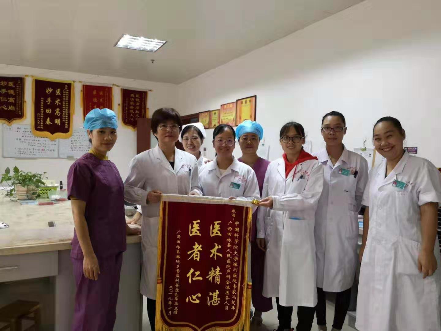 10月19日,H视频 驻田林县H视频 帮扶医疗专家冯笑丰主任医师成功抢救了一例羊水栓塞病人,患者康复出院后送来了一面锦旗,以表谢意。(通讯员 黎海涛)