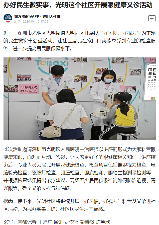 南方都市报:办好民生微实事,光明这个社区开展眼健康义诊活动