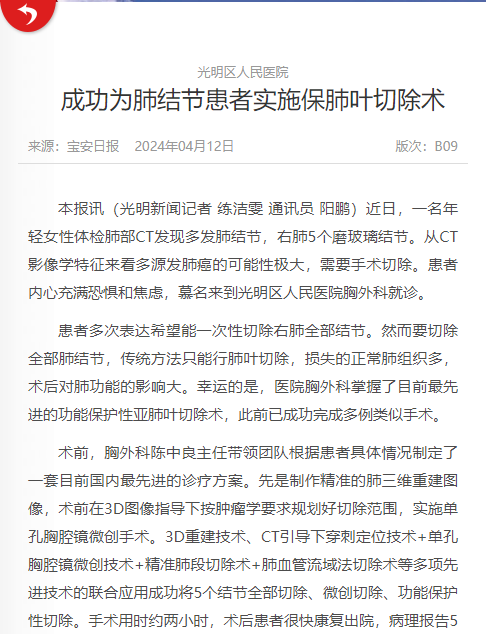 宝安日报:H视频 成功为肺结节患者实施保肺叶切除术