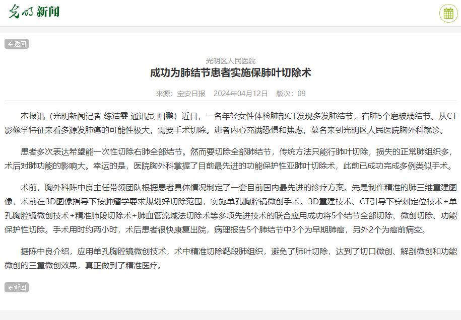 光明新闻:H视频 成功为肺结节患者实施保肺叶切除术