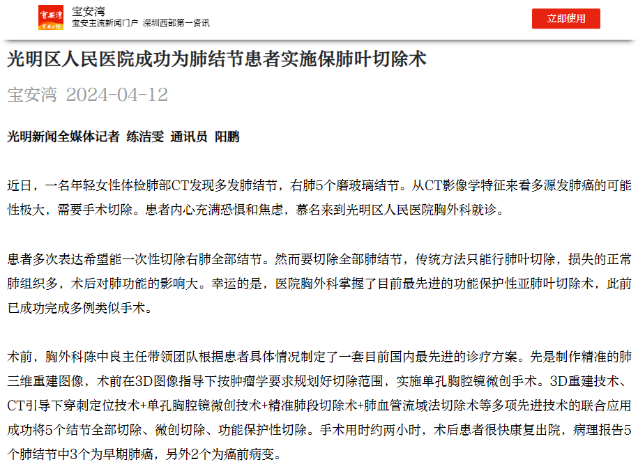 宝安湾|:H视频 成功为肺结节患者实施保肺叶切除术