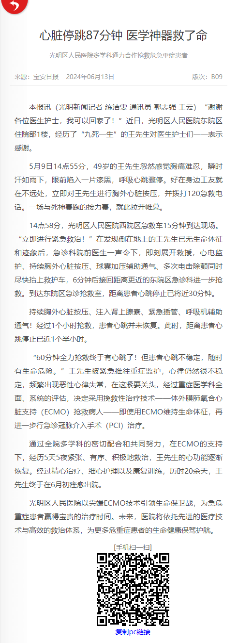 宝安日报:心脏停跳87分钟 医学神器救了命