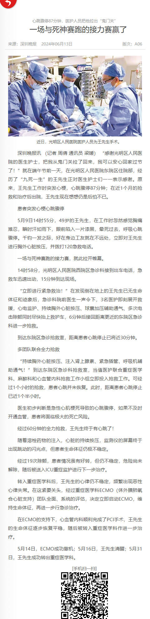 深圳晚报:心跳骤停87分钟,医护人员把他拉出“鬼门关”一场与死神赛跑的接力赛赢了