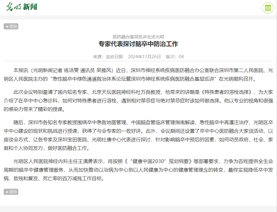 光明新闻:医防融合基层巡讲走进光明 专家代表探讨脑卒中防治工作