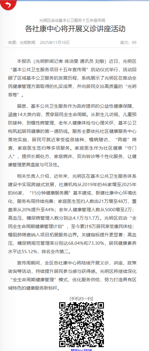 宝安日报:光明区启动基本公卫服务十五年宣传周 各社康中心将开展义诊讲座活动